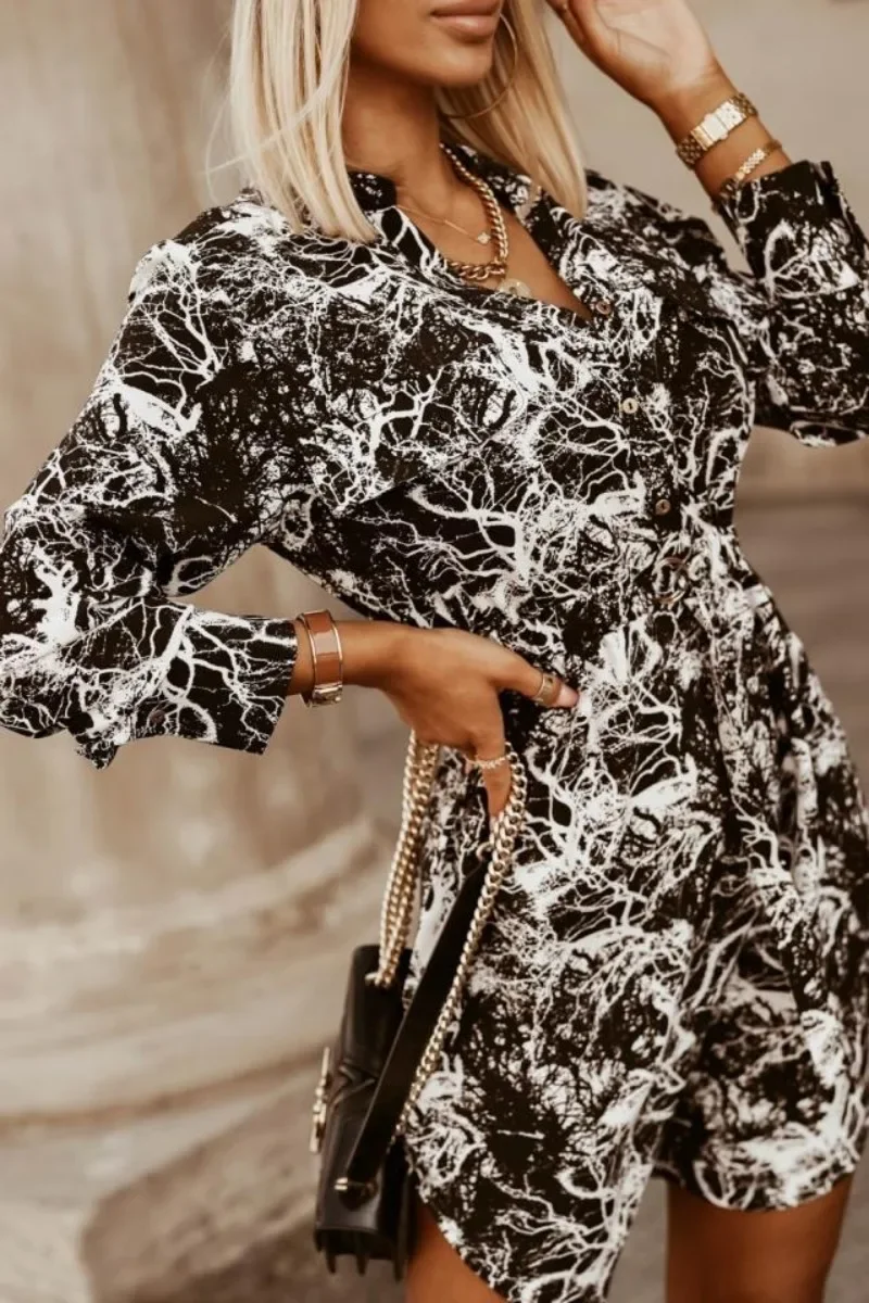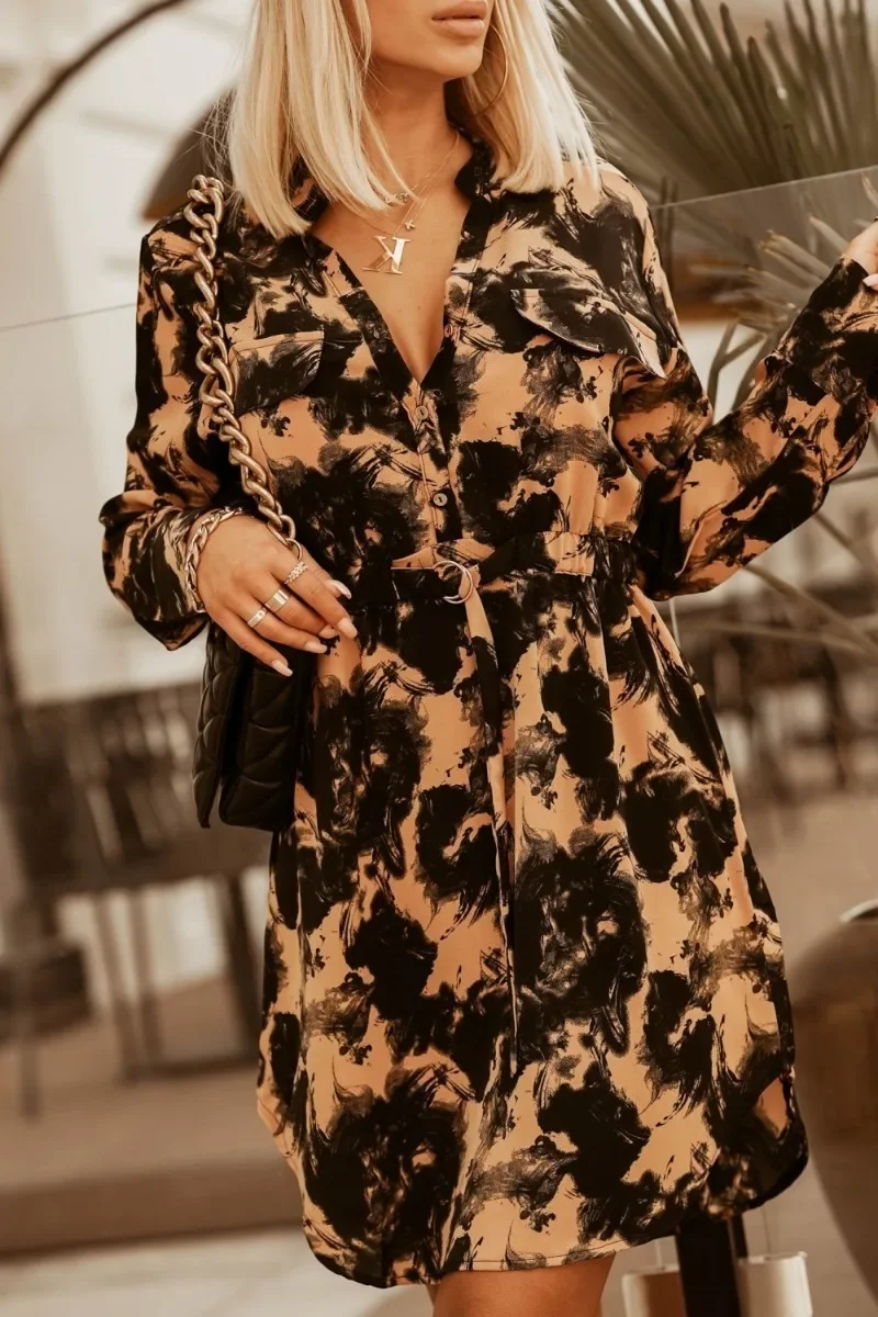 Women's Clothing Spring and Summer Commuter Waist Collection V-Neck Tie Long Sleeve Printed Pullover Shirt Dress