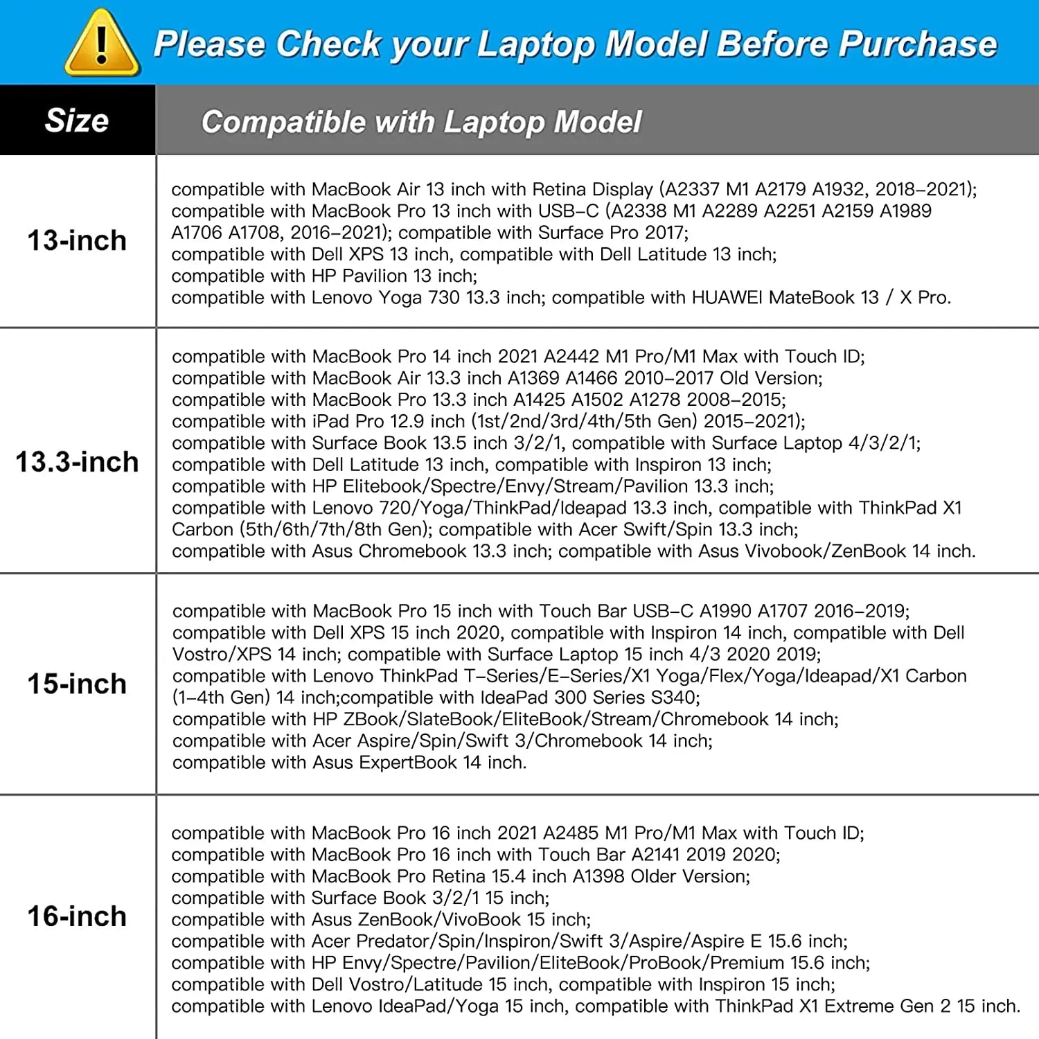 Compatible With: MacBook Air 13 inch with Retina Display Touch ID,MacBook Pro 13 inch with/without Touch Bar 2023-2016,MacBook Pro 14 M1 A2442,MacBook Air 13 inch A1369 A1466 2010-2017,MacBook Pro 13 inch A1425 A1502 A1278 2008-2015,MacBook Pro 15 inch with Touch Bar USB-C A1990 A1707 2016-2019,MacBook Pro 16 inch 2023-2021 M3 A2991 M2 A2780 M1 A2485,MacBook Pro 16 A2141 2019 2020,MacBook Pro Retina 15.4 A1398,MacBook Air 15 inch M3 A3114 M2 A2941,MacBook Pro 14 inch M3 A2918 A2992,MacBook Pro 14 inch M2 A2779